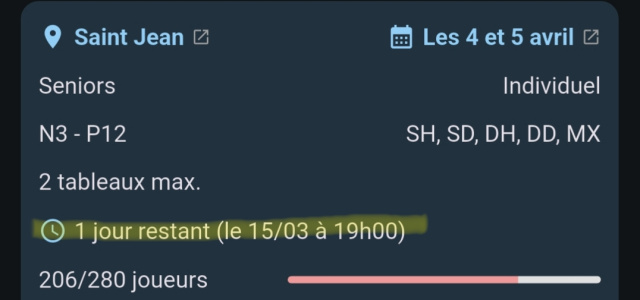 Bonjour, Dernier jour pour s'inscrire à notre tournoi de Pâques qui aura lieu le 4 et 5 Avril 2026. Inscription sur ebad jusqu'au 15 Mars 19h00 🗓️✅ Réservez vite votre weekend de Pâques à nos côtés 🏸👊 Le bureau.